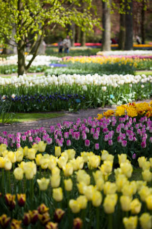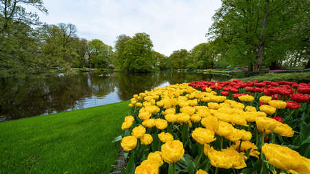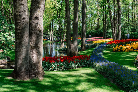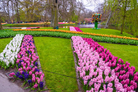 Scenic view of Keukenhof tulip garden in Lisse, Netherlands. Keukenhof is the most beautiful spring garden in the world. Beautiful ornamental garden landscape at Lisse, Netherlands