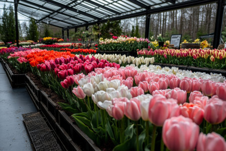 colorful tulips growing on plantation in glass greenhouse
