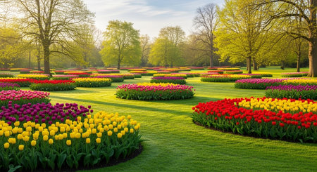 Explore the vibrant tulip garden at Keukenhof, showcasing a stunning array of colorful flowers in a picturesque landscape. A perfect spot for relaxation and photography.