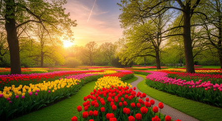 Explore a vibrant tulip garden showcasing a beautiful pathway surrounded by colorful blooms and lush greenery, perfect for a tranquil spring stroll.
