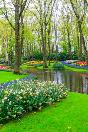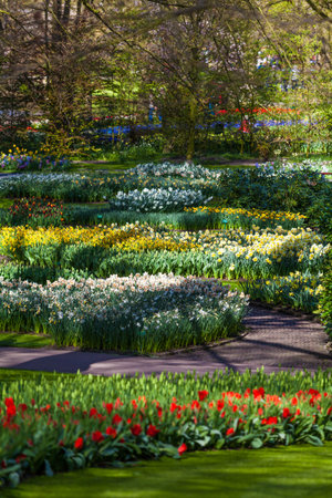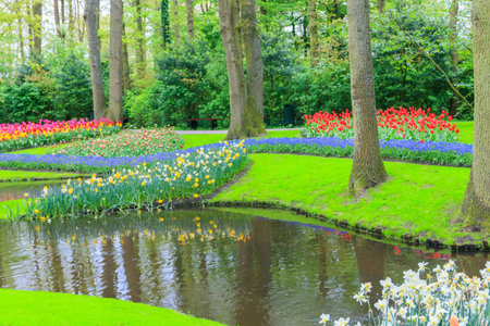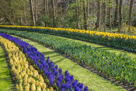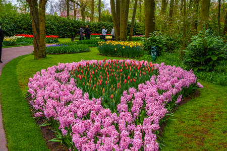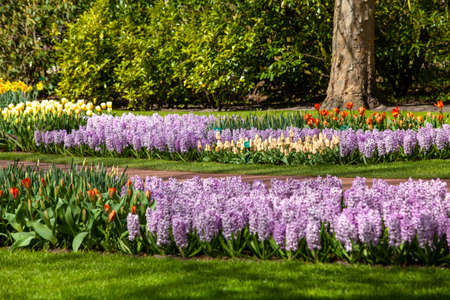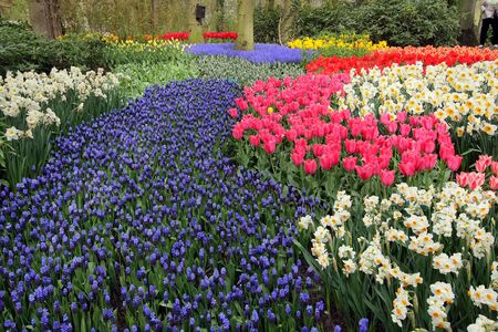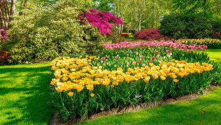 Admirable flowery glades with fresh spring flowers and colorful tulips in the beautiful Keukenhof garden, Lisse, Netherlands. Spring gardening and decorational concept