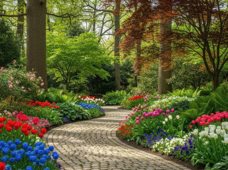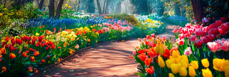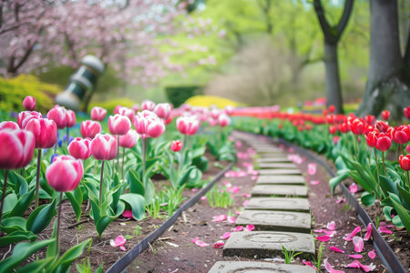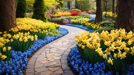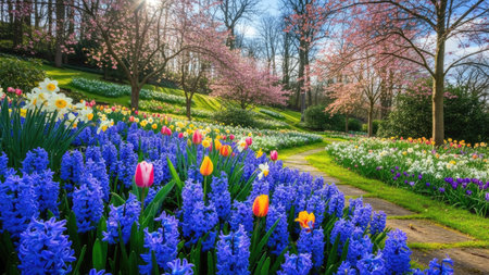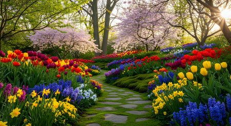 A beautiful spring garden path, made of stone, winds through vibrant flower beds. The garden is filled with colorful tulips, hyacinths, and daffodils, with blooming cherry blossom trees in the background.
