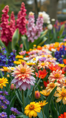 A vibrant mix of colorful flowers bloom in a lush garden setting.