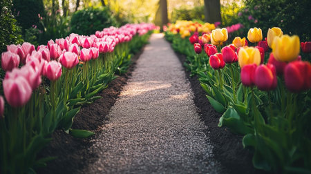 A stunning garden path lined with vibrant tulips in various colors, with lush greenery surrounding the tranquil scene. Ideal for nature lovers.