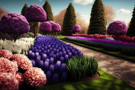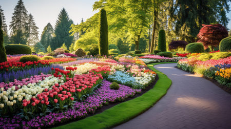 beauty of a panoramic garden scene, with blooming flowers and winding paths. Generative AI