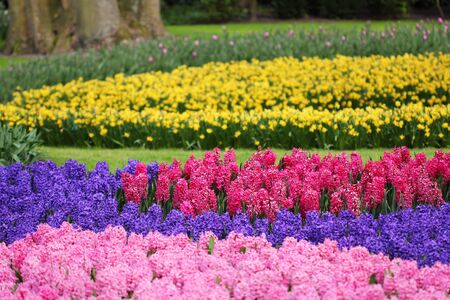 Fresh early spring pink, purple, white hyacinth bulbs. Flowerbed with hyacinths in Keukenhof park, Lisse, Holland, Netherlands.