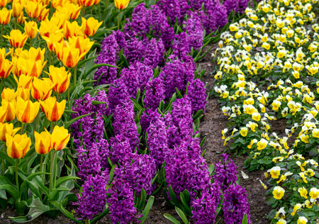 Pansies, purple hyacinths and yellow tulips bloom in the park in early spring
