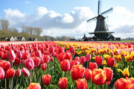 Spring landscape with windmill park and vibrant tulip flowers in Noordoostpolder Flevoland
