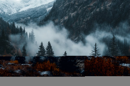 Mountain landscape with coniferous forest and fog in the morning
