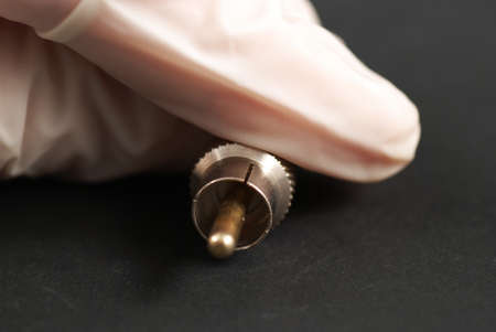finger holding silver bullet
