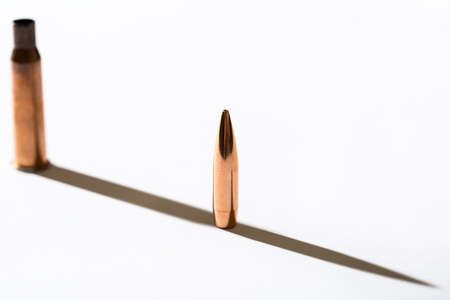 Macro shot of the used cartridge case 5.45 on a white studio background. Sleeve casts a shadow on the tough end of which is shiny copper bullet.