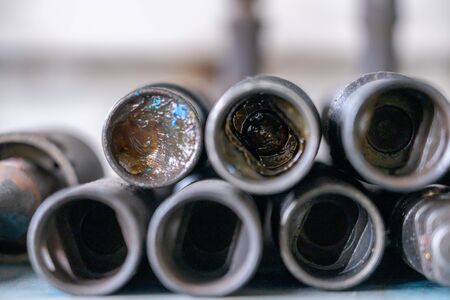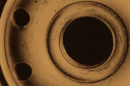 Monochrome background image of oil filter close up. Art macro photography of auto part in sepia tones.