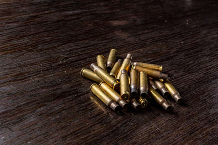 Empty bullet casings on a dark, wooden table.