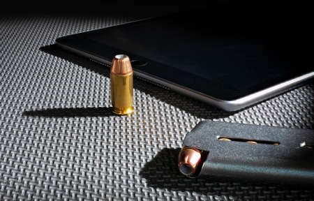 Ammunition and gun magazine next to a tablet