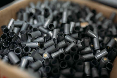 Shooting range. A lot of empty bullet cartridgesare in the box.