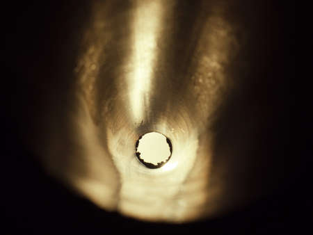 Close-up of a brass cylindrical object with a central hole, showing texture and detail.