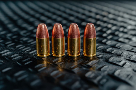Group of copper and gold bullets reflecting on a dark background, creating a dramatic and intense atmosphere