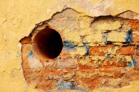 Dramatic close up of textured red brick wall with peeling yellow plaster, highlighting severe cracking and damage around a central black void for copy space usage.
