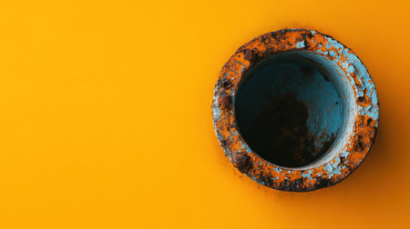 A close-up view of a rusty pipe set against a bold yellow background, showcasing vibrant colors and intriguing textures that evoke a sense of decay and character.