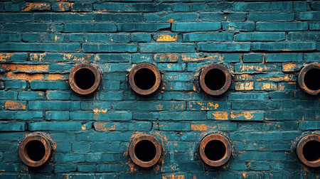 A striking image of a weathered turquoise wall with circular metal pipes, highlighting urban decay and artistic design in an industrial environment.