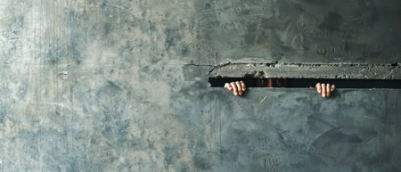 A pair of hands reach through a crack in a concrete wall, revealing a person looking out from the other side.