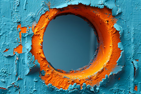 An abstract art piece featuring a circular hole in a textured surface. bright orange contrasts with vivid blue, showcasing a compelling visual of peeling paint and rough textures. perfect for modern art designs, posters, and creative prints. Generative AI