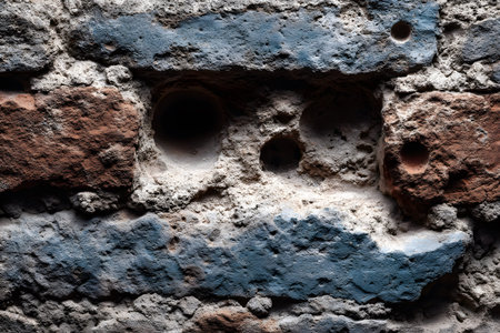 A close-up view of a weathered brick wall showcasing a blend of red and blue antiqued textures. the aged surface features various holes and textures, ideal for architectural design and background use. Generative AI