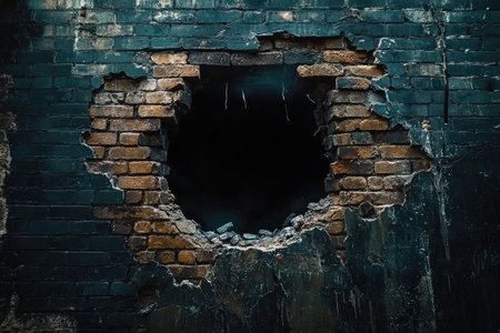 An illustration of a brick wall with a large, central hole, surrounded by spreading cracks, with the hole appearing deep and dark. realistic portrait. 4k image, Canon EOS R5. --ar 3:2 --style raw --sref 1113391764 --stylize 400 --v 6.1 Job ID: 506a16f8-0d9c-4050-b468-07e1872f03d2