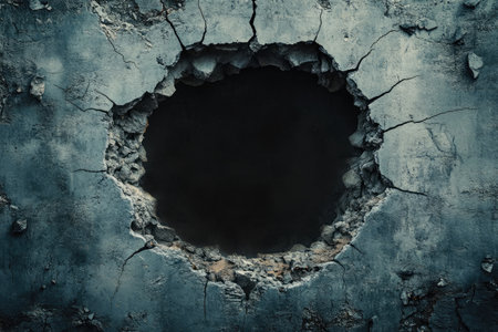 An illustration of a thick concrete wall with a massive, jagged hole in the center, cracks radiating outward like a spiderweb, the interior of the hole a deep, shadowy void realistic portrait. 4k image, Canon EOS R5. --ar 3:2 --style raw --sref 1113391764 --stylize 400 --v 6.1 Job ID: 3f6bb90e-e37f-4c33-bb51-5f130e4bed86