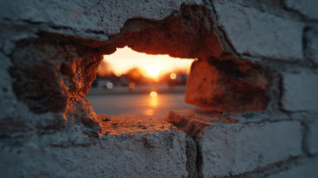 A captivating view of a sunset framed by a cracked brick wall, showcasing warm colors and unique textures, evoking a feeling of tranquility and beauty.