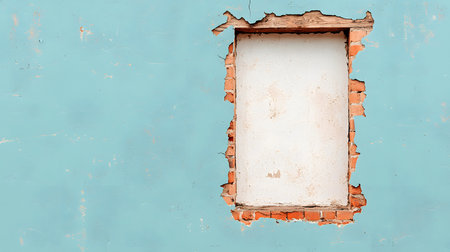 A rectangular void in a light blue wall reveals exposed bricks and peeling paint, creating an intriguing contrast. The atmosphere evokes a sense of rustic charm and decay.