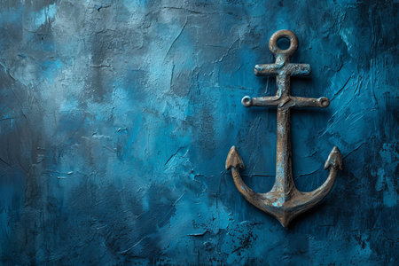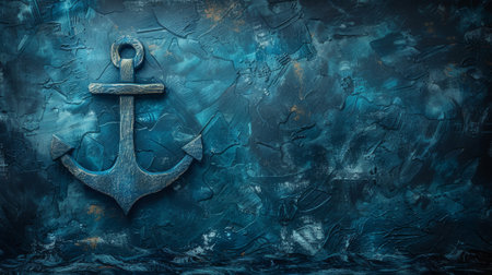 A vintage anchor rests against a textured blue background adorned with gold accents, creating a striking visual for nautical-themed designs and decor.