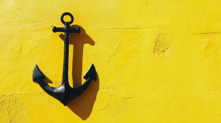 A striking black anchor stands out against a vibrant yellow wall, creating a stunning visual contrast. This image symbolizes stability and marine themes, ideal for decor inspiration.