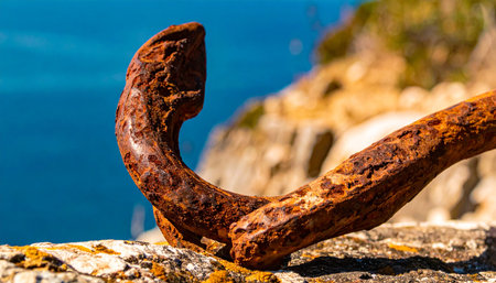 A heavily corroded mooring hook stands as a silent sentinel against the vibrant blue sea. Its textured, rusted surface tells a story of countless storms and the relentless passage of time, symbolizing enduring strength, industrial history, and a steadfast connection to the coast.