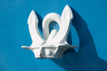 Old anchor blue on a white board the ship.