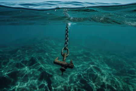 That the image is generated using AI. Rusted anchor resting on seabed amidst aquatic tranquility and particulate suspense.