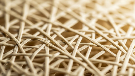 Detailed close-up view of intertwined natural fibers showcasing warm golden tones and intricate textures, ideal for design projects, textile applications, or artistic inspiration