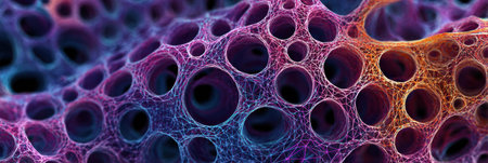Explore the detailed arrangement of cells displaying unique porous formations under high magnification in a biological sample.