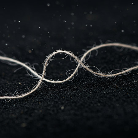 A detailed macro shot captures intertwined dark blue and black textured ropes. The foreground exhibits a precise weave, contrasted by a blurred background with blue light. AI-generated content