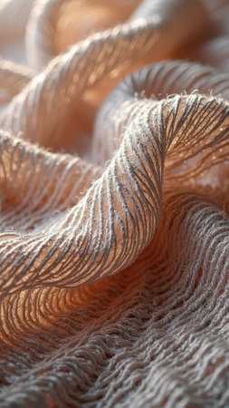 Close-up of intricate beige textile fabric with detailed threads and fibers. That the image is generated using AI.