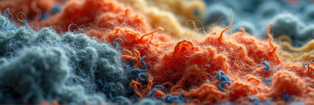 Colorful textile fibers close-up: red, orange, pink, blue, yellow textures. That the image is generated using AI.