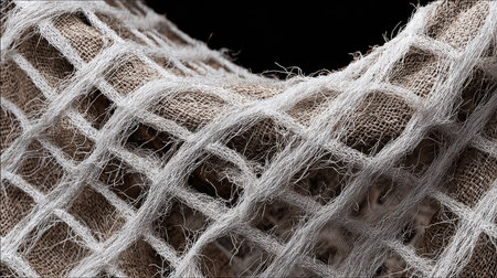 This close-up image showcases the intricate texture of burlap fabric, highlighting the natural fibers and weaving pattern against a dark background.