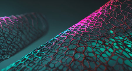 Futuristic close-up of synthetic mesh structure in silver-blue tones, representing biotech innovation, science and artificial skin