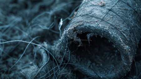 A detailed view of a dark gray material hugging a large pipe with thin strands of insulation trailing off the edges