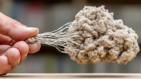 A person holds a fluffy dust bunny made of cotton fibers in this close-up image, symbolizing indoor dust issues. This visual emphasizes the importance of home cleaning.