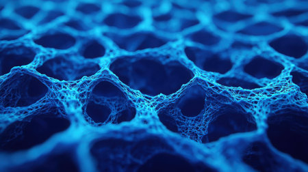 A close-up view of an abstract blue network structure with interconnected nodes. This digital artwork highlights intricate patterns and textures, creating a visually striking composition.