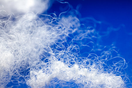 Extreme macro of polyester stable fiber on blue background. Selective focus, shallow depth of field. Abstract dreamy background