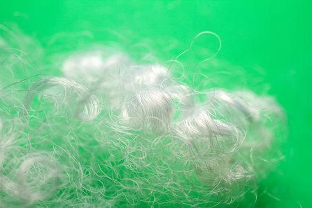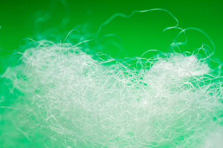 Extreme macro of polyester stable fiber on green background. Selective focus, shallow depth of field. Abstract dreamy background