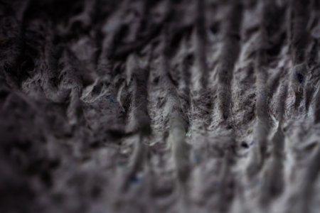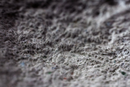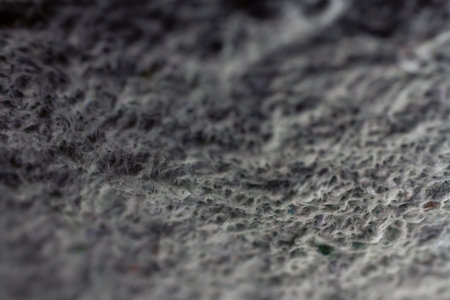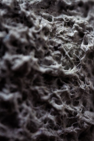 Extreme close up of old gray handmade paper clay with a structure and rough texture. Paper recycling. Selective soft focus, shallow depth of field.