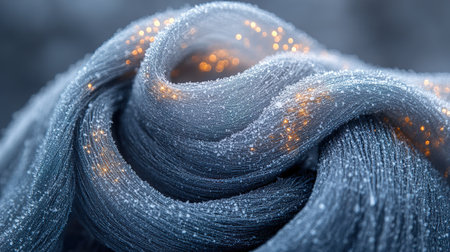 close up of shimmering, frost covered fabric with glowing lights creates magical, wintery atmosphere. intricate texture and sparkling details evoke sense of wonder and elegance.